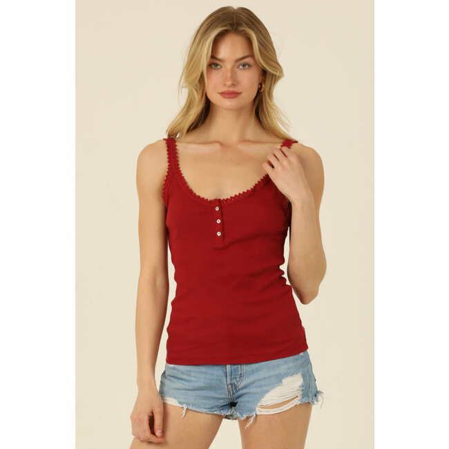 Ribbed tank top with lace detailing and feminine buttons. Fitted silhouette.