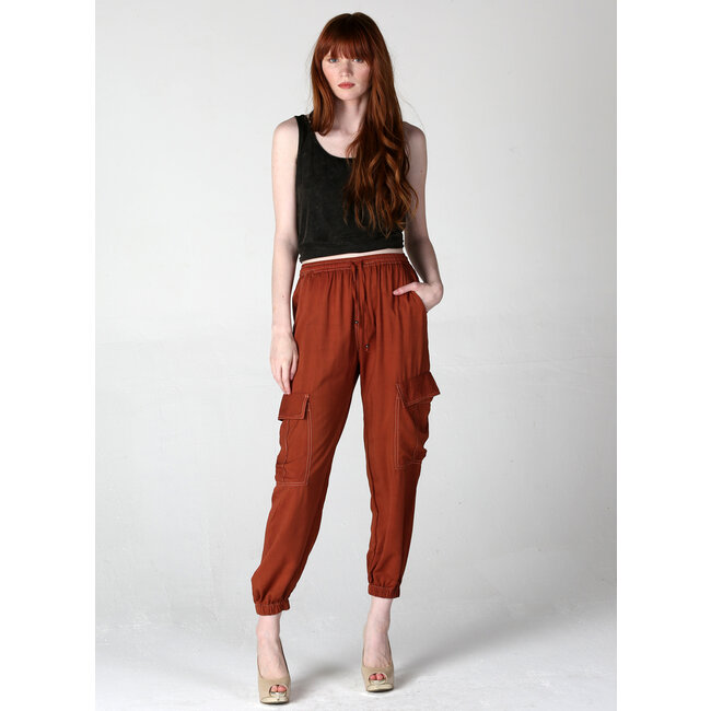 A super soft pair of jogger style pants inspired by the military utilitarian trend. Available in the best earthy color to transition in to the fall season perfectly. Elasticized waist band with adjustable drawstring.