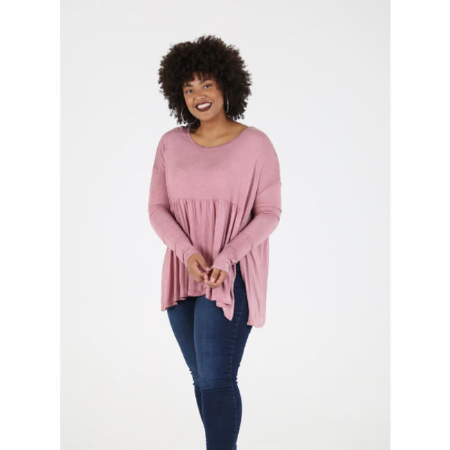 A light weight flowy comfortable long sleeve baby doll top with 2 tires and a side slit.