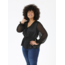 A fun sheer sleeve lace up top that gathers at the waist giving a peplum silhouette.