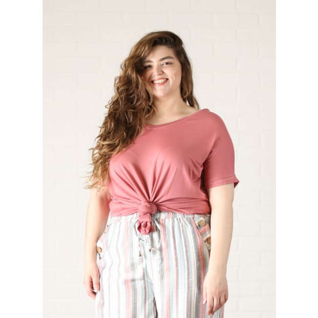 An Angie over-sized knit tee featuring a V-neck neckline, short sleeves, side slits, and a hi-lo longline silhouette.