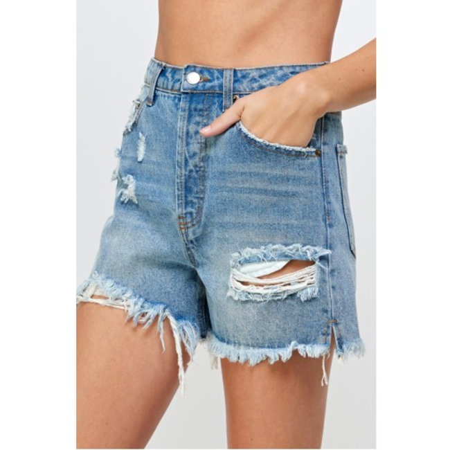 HIGH RISE DESTROYED DENIM SHORTS FEATURE CENTER BUTTON DOWN FOR CLOSURE. MID LENGTH. SIDE AND BACK POCKETS. BELT LOOPS. FRINGE ENDS. SHORT SIDE SLITS